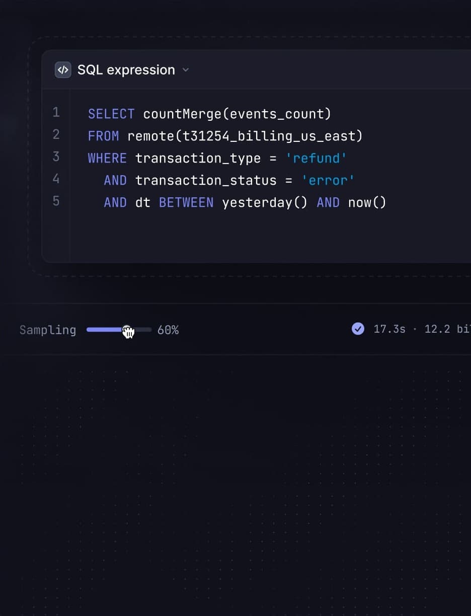 Search raw JSON events with 100s of nodes from S3. Run arbitrary SQL queries and leverage query time sampling to get ad-hoc insights about trends at scale or store time series on NVMe SSD for fast analytical queries used in your APIs.