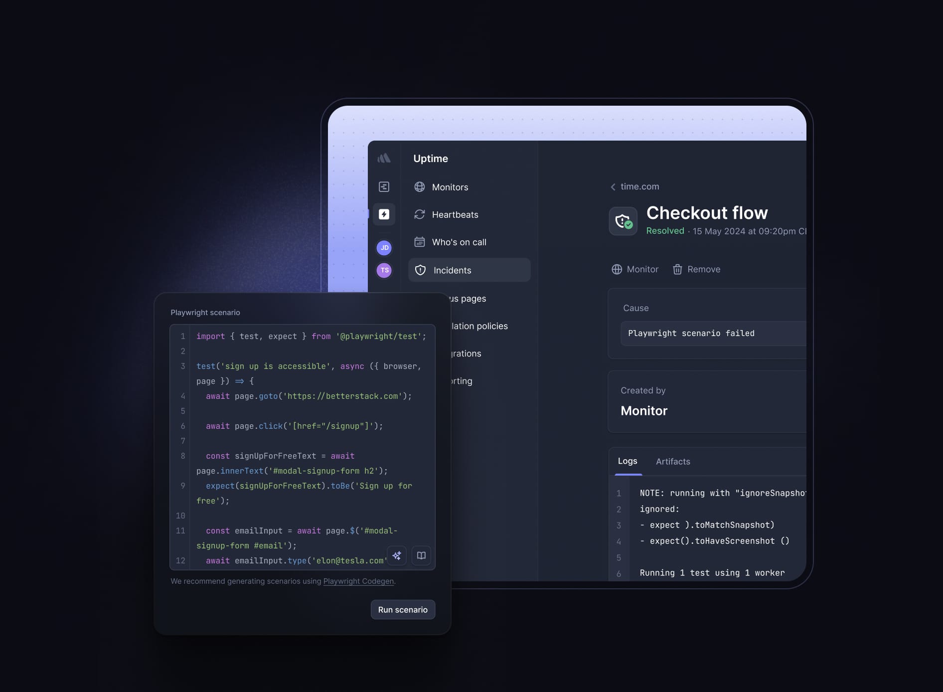 Re-use your existing Playwright code to run all browser checks. No need to reinvent the wheel.